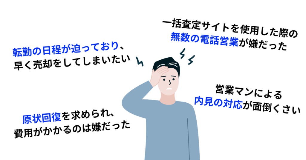 下記のような様々な悩みを抱えて、実際に今話題のマンション買取サービスを利用して不動産売却をしたお客様の口コミも紹介します!