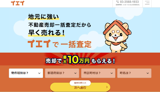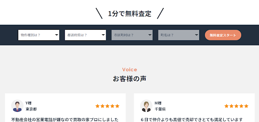 トップページでは物件種別と査定地のおおまかな住所を選択する画面が表示されています。