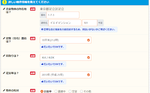 - マンションの地番やマンション名、専有面積、築年数を入力