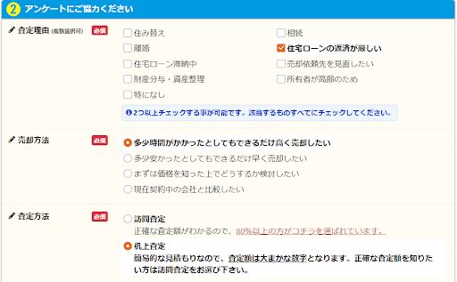 - 査定理由や売却方法、査定方法を選択