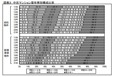 引用:築年数から見た首都圏の不動産流通市場(2021年)図表3中古マンション築年帯別構成比率|公益財団法人 東日本不動産流通機構