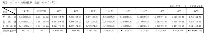 引用:全国 新築分譲マンション市場動向 2021 年(表③マンション価格推移 全国2012〜2021年)|株式会社不動産経済研究所