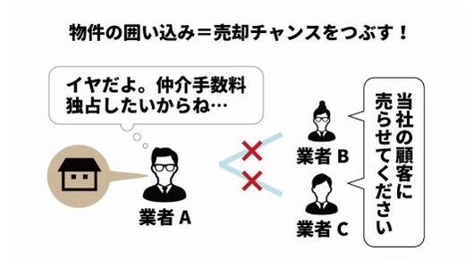他社が抱える買主が内見や契約をするチャンスをことごとく潰すため、成約チャンスの減少・売却活動の長期化・売れ残りによる値下げなどを招きます。