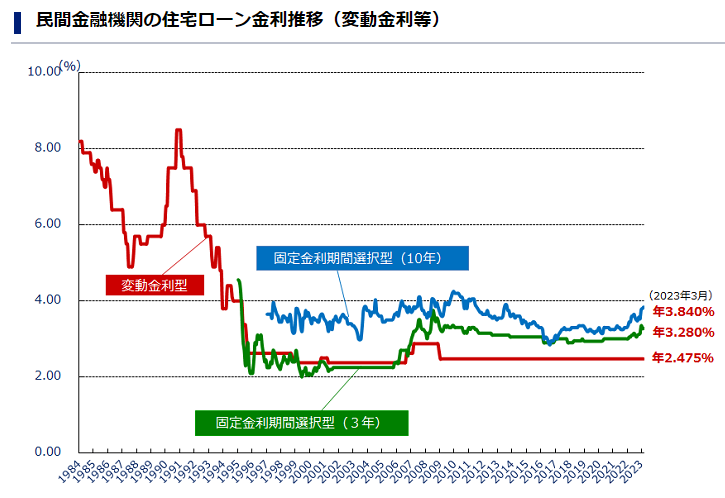 下図は住宅金融支援機構が公表している、民間金融機関の住宅ローン金利の推移を表した図です。