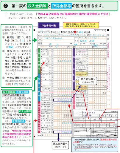 「第一表の確定申告書」の「所得金額」などを見ながら税金を計算、記入してみましょう。
