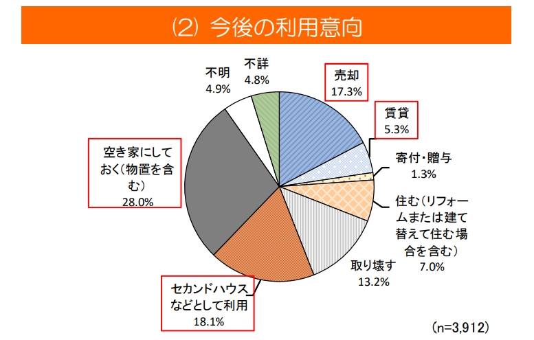 相続後の利用方法は「1位:空き家のまま(28%)」「2位:セカンドハウス(18.1%)」「3位:売却(17.3%)」となっています。詳しくは国土交通省がまとめた「令和元年空き家所有者実態調査」をみるとよくわかりますよ。
