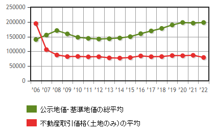 下記のグラフは土地売買取引の平均価格から得られた㎡単価の推移です。