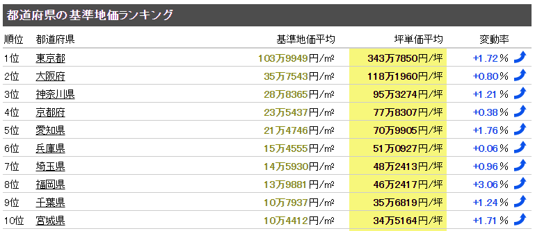 また、下記のデータは2022年の全国の基準地価平均ランキング上位です。
