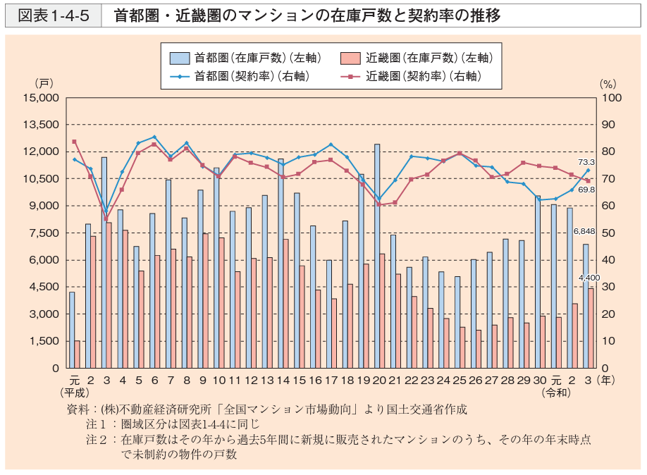 引用:土地白書「図表1-4-5(首都圏・近畿圏のマンションの在庫戸数と契約率の推移)」|国土交通省