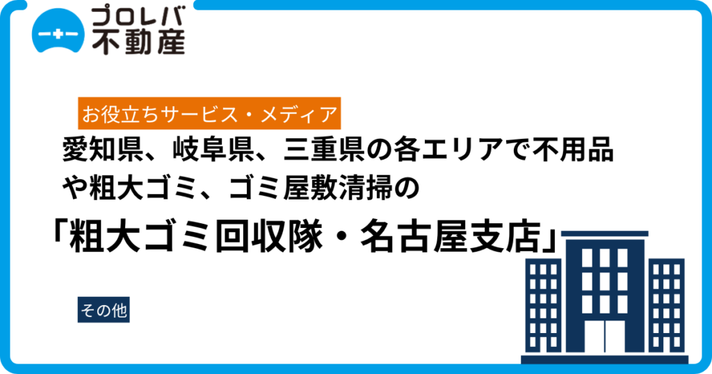 愛知県、岐阜県、三重県の各エリアで不用品や粗大ゴミ、ゴミ屋敷清掃を専門に行っている「粗大ゴミ回収隊・名古屋支店」の公式サイトに、プロレバ不動産が掲載されました。 粗大ゴミ回収隊名古屋で効率よく不用品を処分 粗大ゴミ回収隊・名古屋支店とは 「...