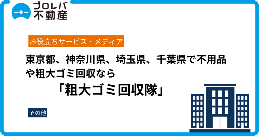 東京都、神奈川県、埼玉県、千葉県で不用品や粗大ゴミ回収を行っている「粗大ゴミ回収隊」の公式サイトに、プロレバ不動産が掲載されました。 粗大ゴミ回収隊が選ばれる理由を知る 粗大ゴミ回収隊とは 「粗大ゴミ回収隊」は、東京都、神奈川県、埼玉県、千...