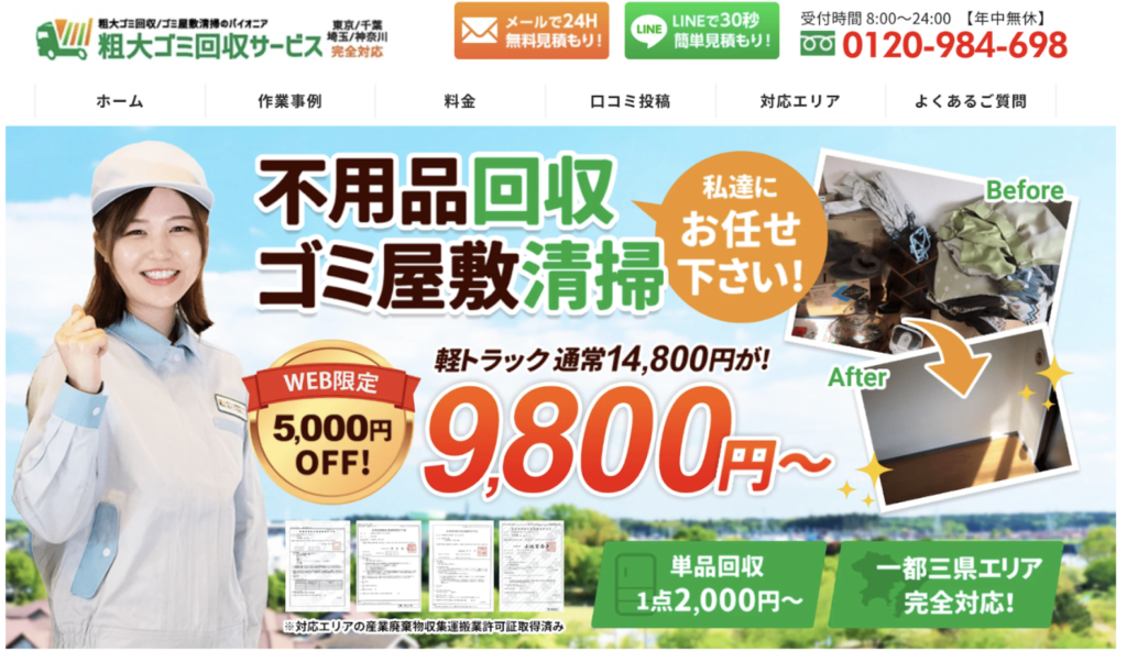 「粗大ゴミ回収サービス」では、8:00から24:00まで対応可能で、LINEや電話での無料見積もりもご提供しています。見積もり後の追加料金は一切発生せず、さらに、状態の良い不用品の買取も行っています。