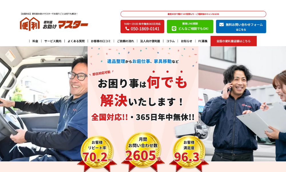 【全国チェーン】町の便利屋が即日解決「便利屋お助けマスター」 2025 3/13 2025年3月13日 便利屋お助けマスター全国本部は全国チェーンの便利屋さんです。東京や大阪、名古屋や福岡はもちろん、各地方のお困りごとにも最短即日解決いたします。 【全国チェーン】便利屋お助けマスターが何でも解決!町の便利屋が即日解決 遺品整理・生前整理なら全国即日対応の「しあわせの遺品整理」 奈良全域のお悩みをなんでも解決!「奈良の便利屋お助けマスター」