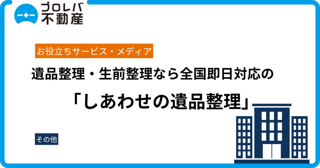 紹介文:遺品整理や生前整理、特殊清掃やゴミ屋敷片付けなど、はばひろく対応しているしあわせの遺品整理は全国で即日に対応可能。専任の遺品整理士がお伺いします。 遺品整理・生前整理なら全国即日対応「しあわせの遺品整理」